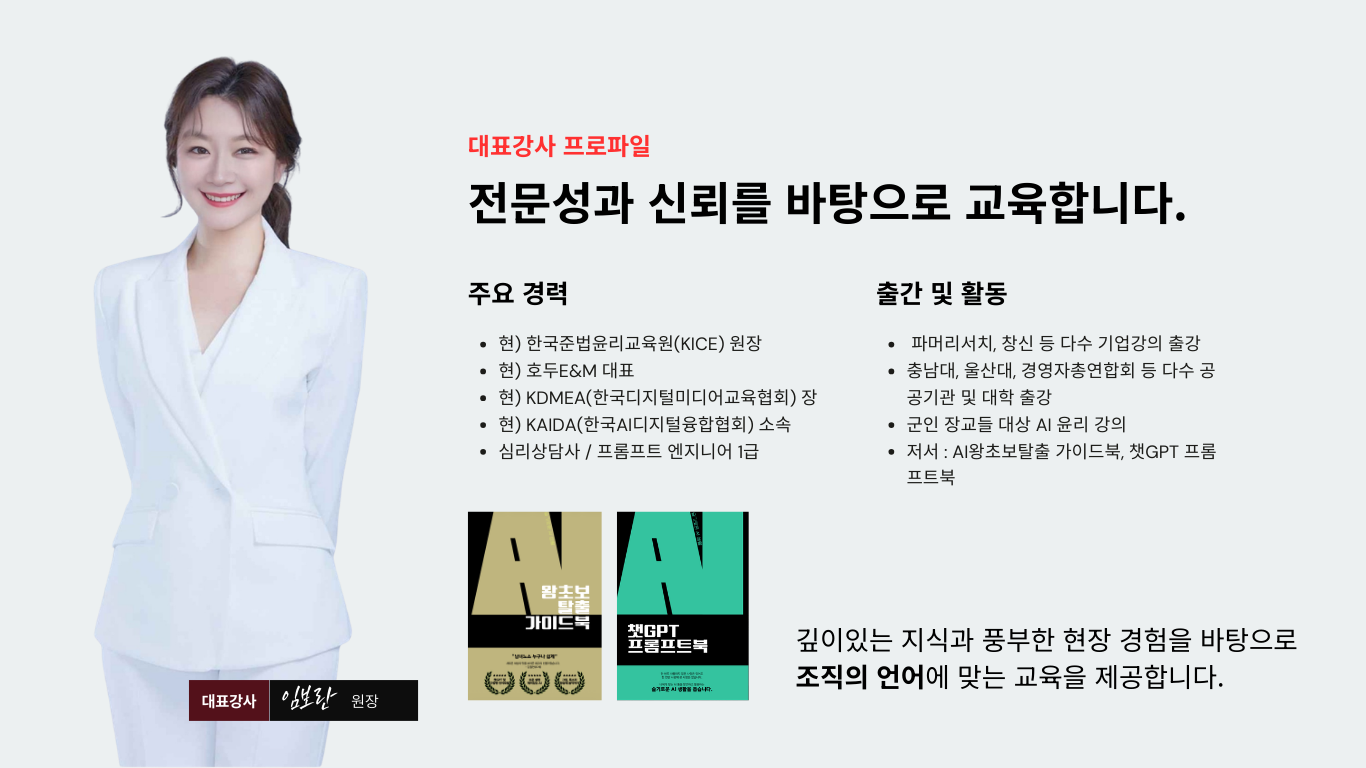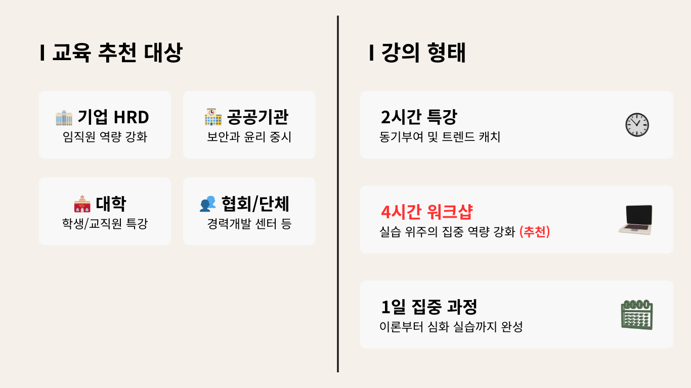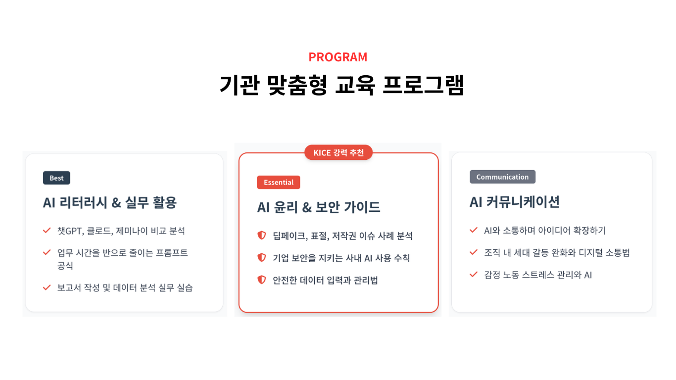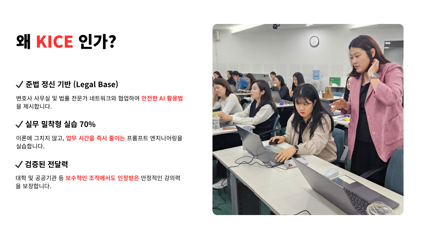 ✅ 16년 교육 노하우와 준법 정신을 결합한 KICE만의 커리큘럼 ✅ 각 기관의 보안 수준에 맞춘 오프라인 맞춤 출강 ✅ 전문가의 현장 밀착 코칭으로 프롬프트 실무 완벽 마스터 ✅ 변호사 네트워크 기반의 검증된 AI 리스크 매니지먼트