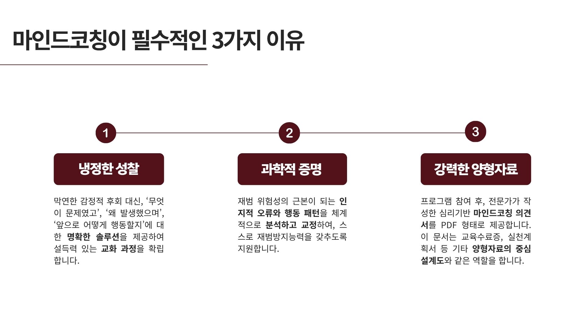 범죄 예정 교육의 핵심을 CBT (인지행동 심리치료) 과정에 통합한 전문 심리상담 프로그램입니다.